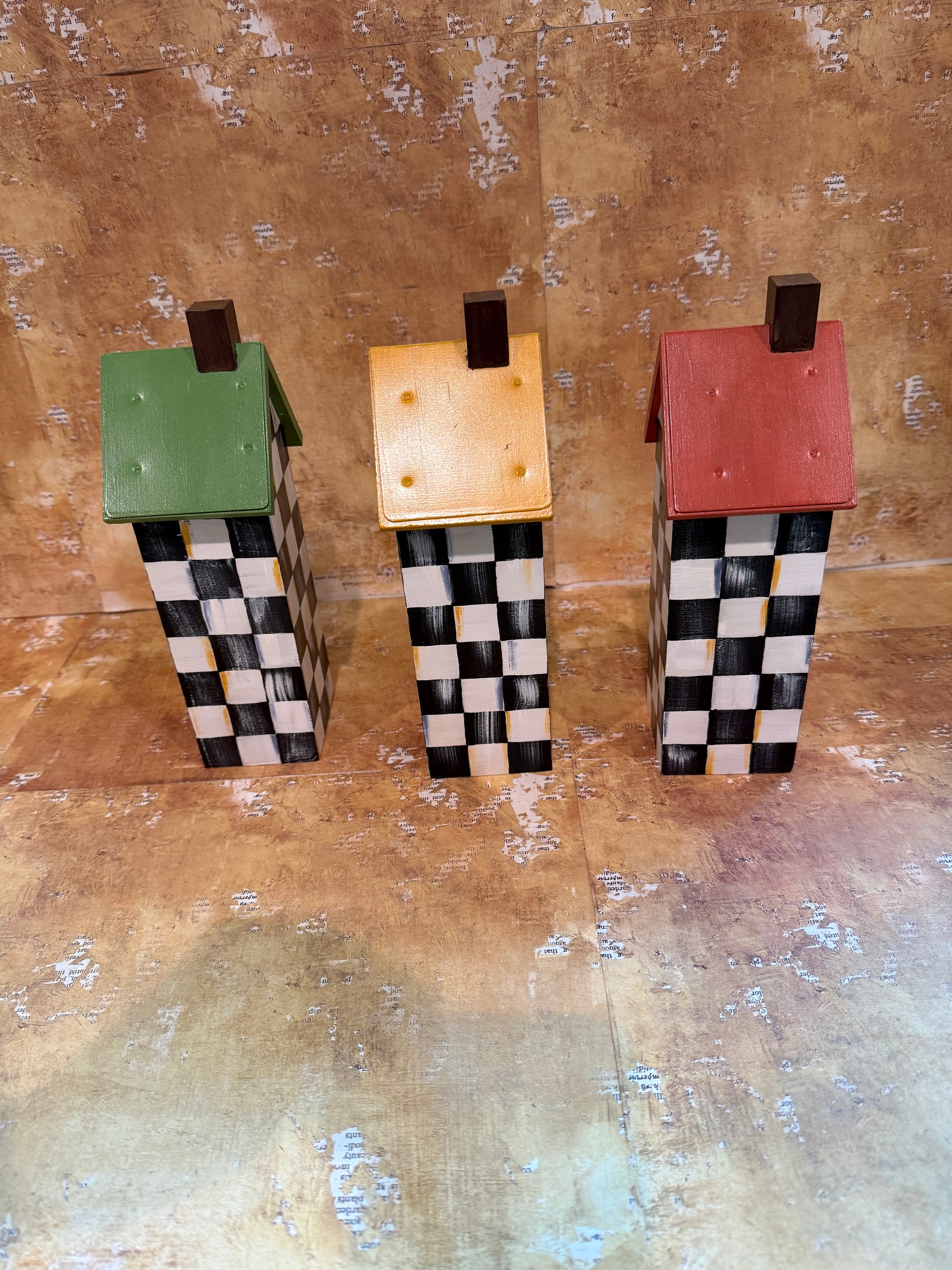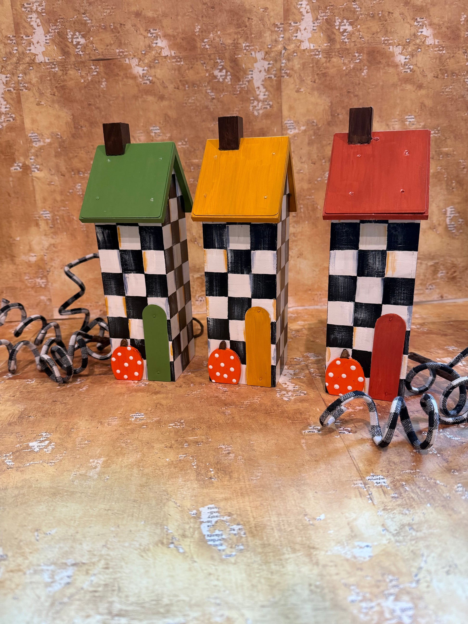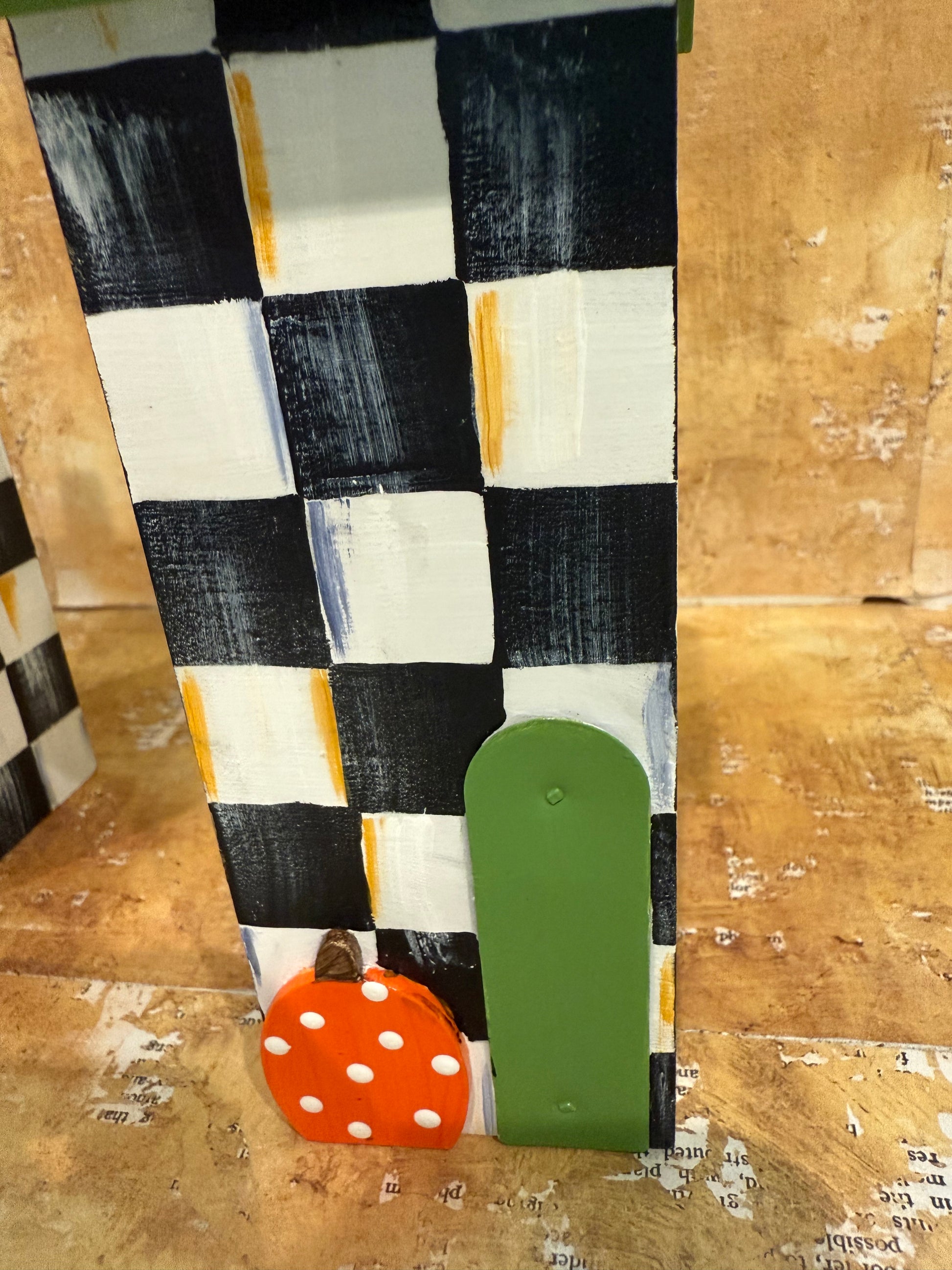 Set of 3 hand painted, wooden houses to enhance your Fall decor! The black and white checks make the colors pop…fresh cut grass green, terra cotta and yellow ochre. Look closely to take in all the details from the metal doors to the polka dot pumpkins. Scroll to the end to see the “before” image.