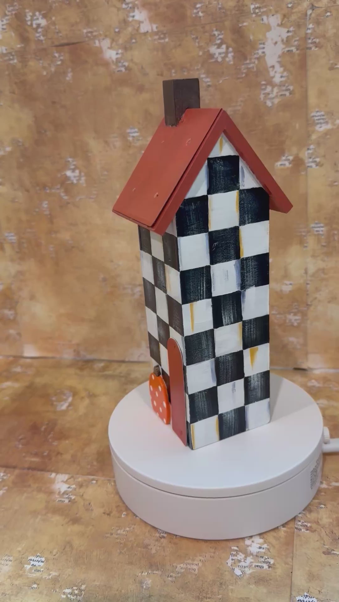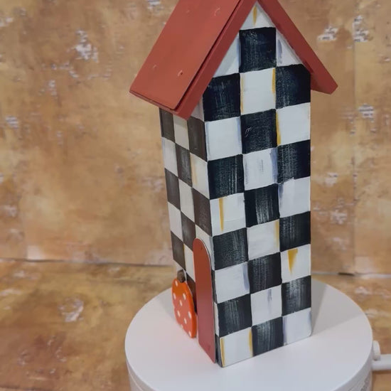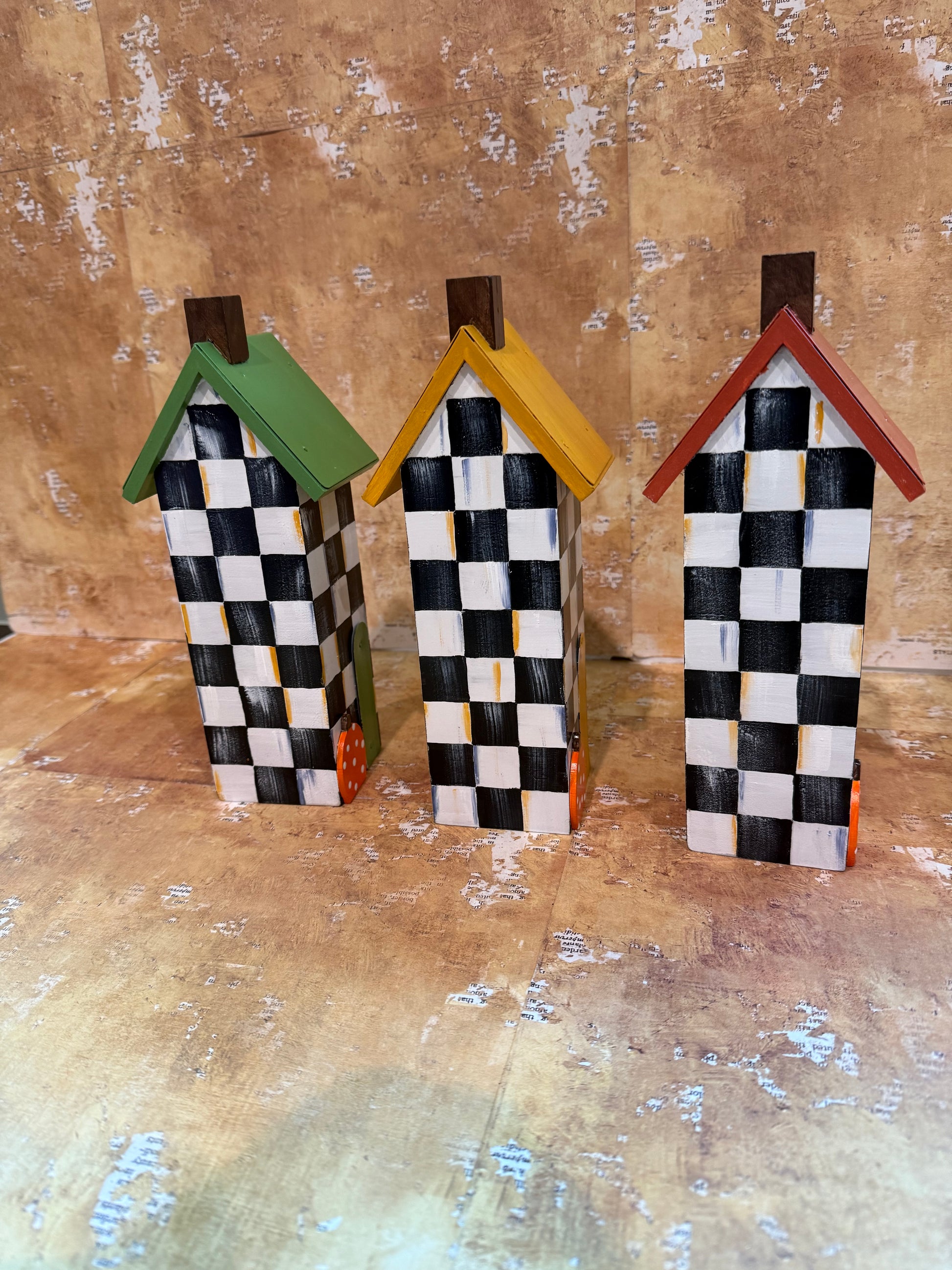Set of 3 hand painted, wooden houses to enhance your Fall decor! The black and white checks make the colors pop…fresh cut grass green, terra cotta and yellow ochre. Look closely to take in all the details from the metal doors to the polka dot pumpkins. Scroll to the end to see the “before” image.