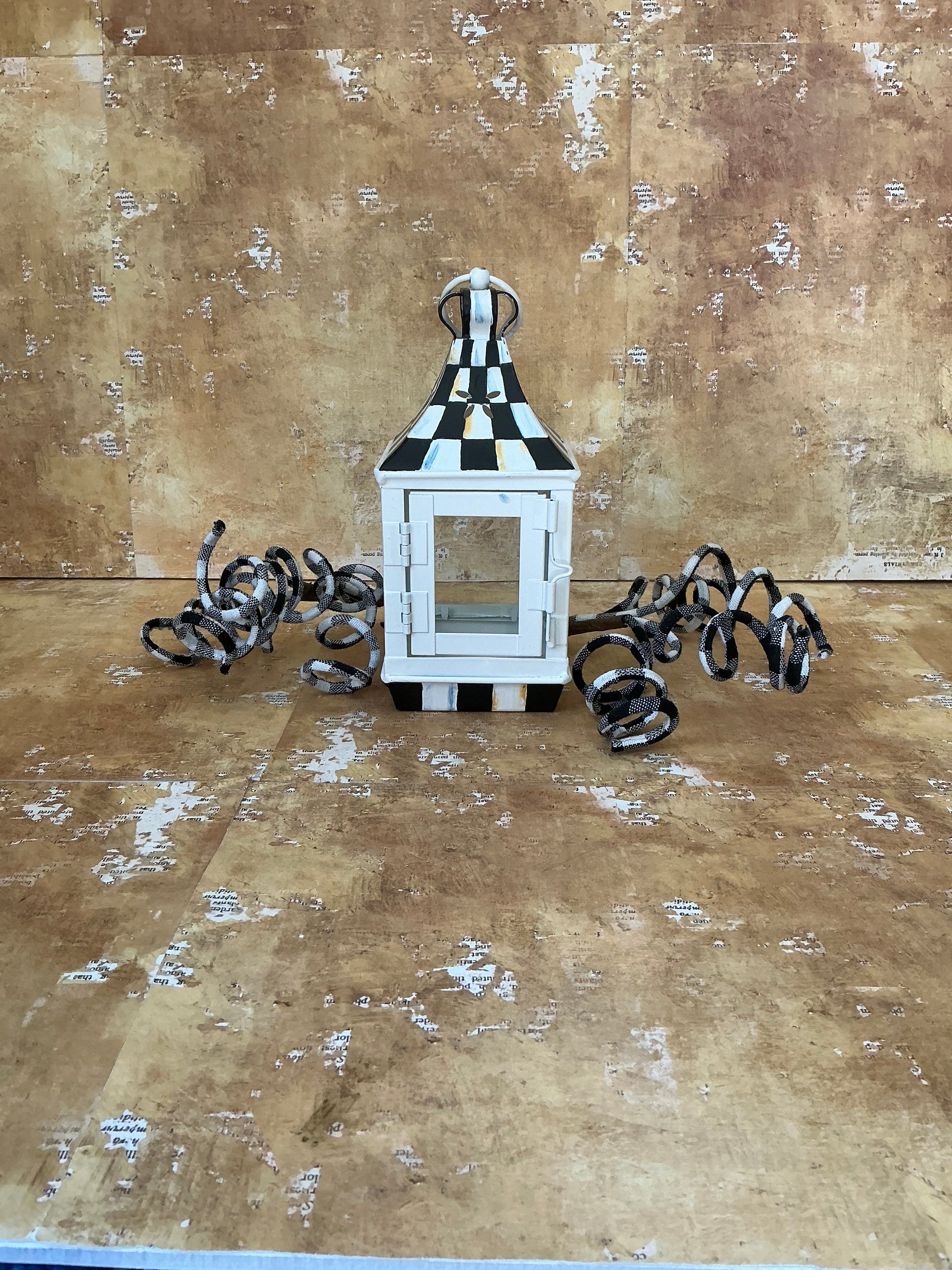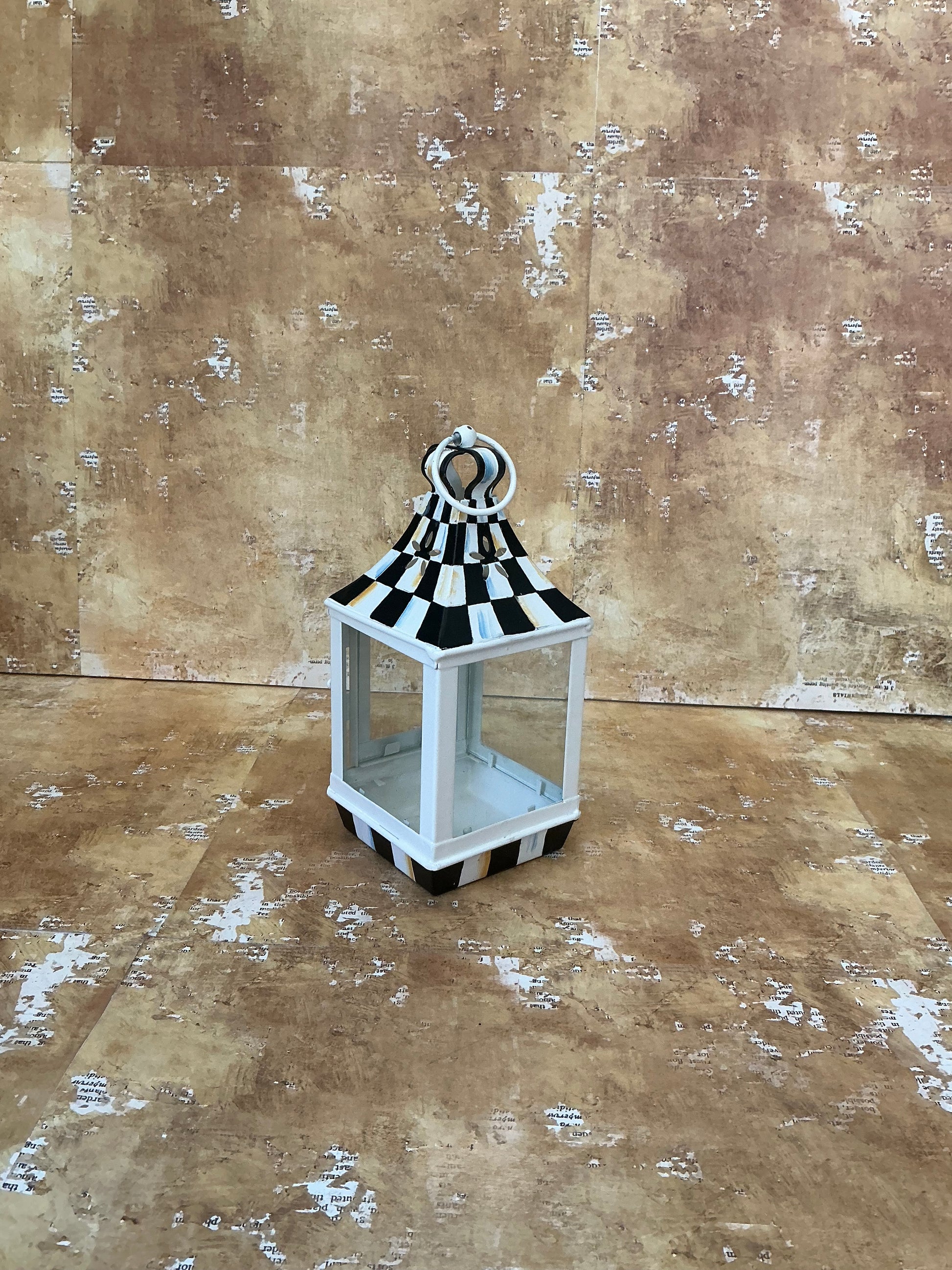 This adorable metal lantern may be small in size, but it’s big in style! The top and base are hand painted with black and white checks and delicately shaded with yellow ochre and dark blue. There is a ring for hanging which sits atop four ribbon-like features. Swing open the latched door and place a 2” candle inside. The prongs which hold the glass in place look like they can be bent, if you want to remove the glass from all sides and fill with a small arrangement.