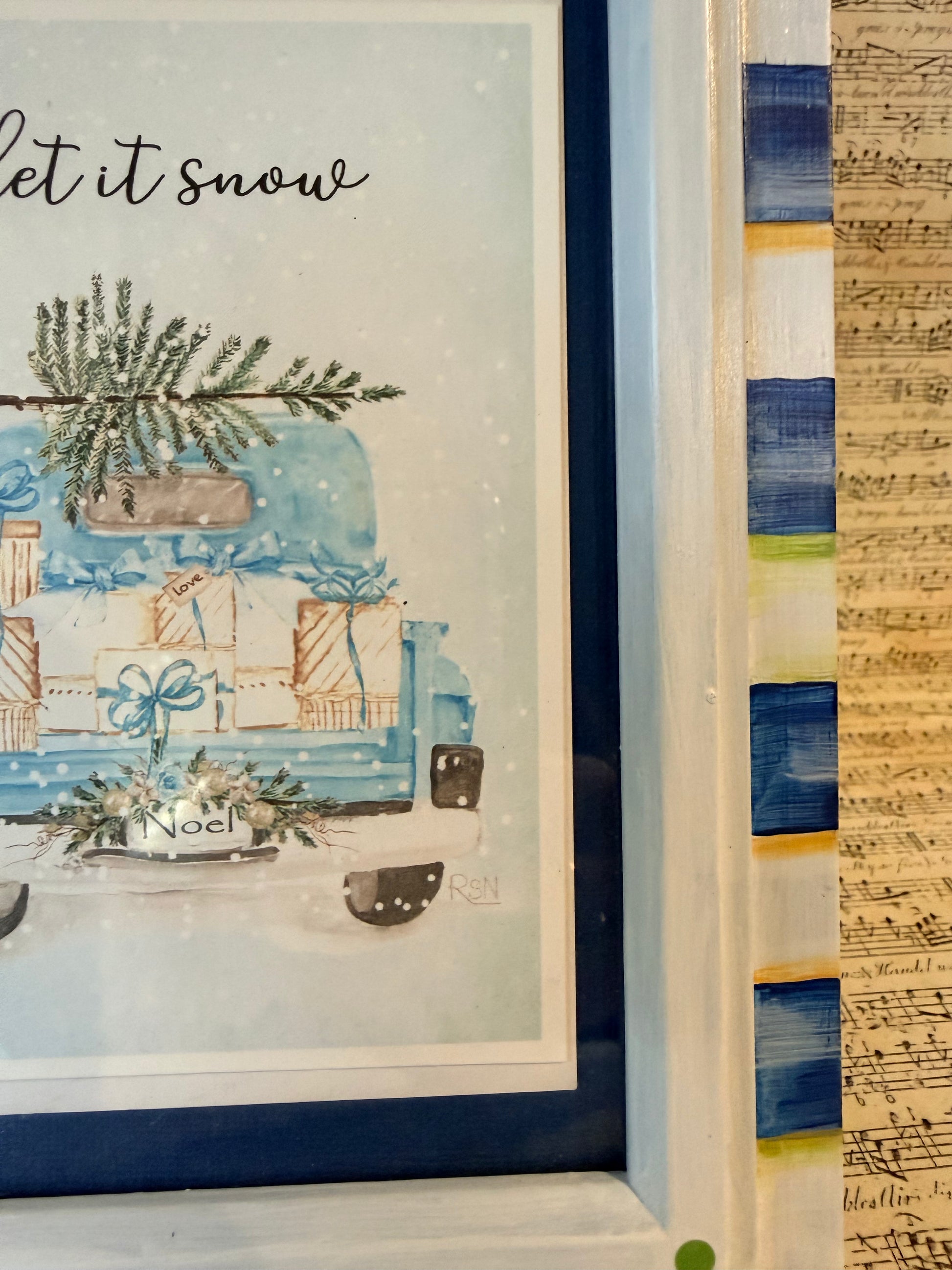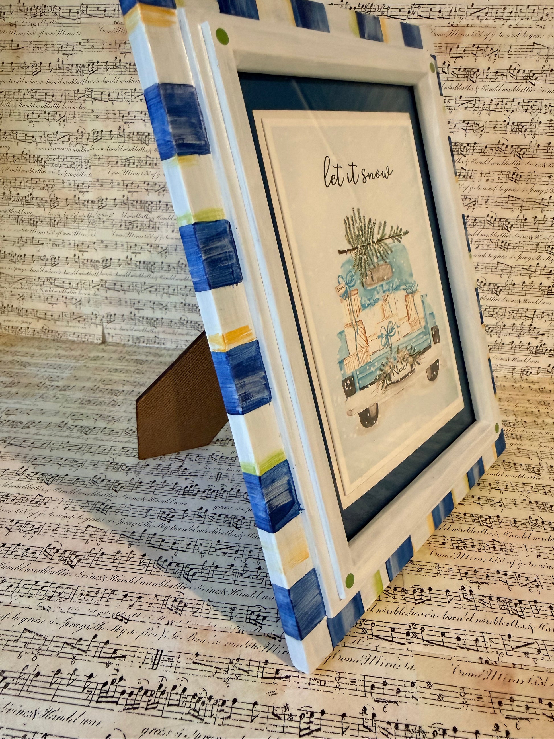 The trim detail on this wood frame is awesome! I painted it white with green dots on the corners. Surrounding that are blue and white wrap around checks shaded with yellow ochre and green. You can replace the Christmas card with your favorite photo! This is a rare, one of a kind frame!
