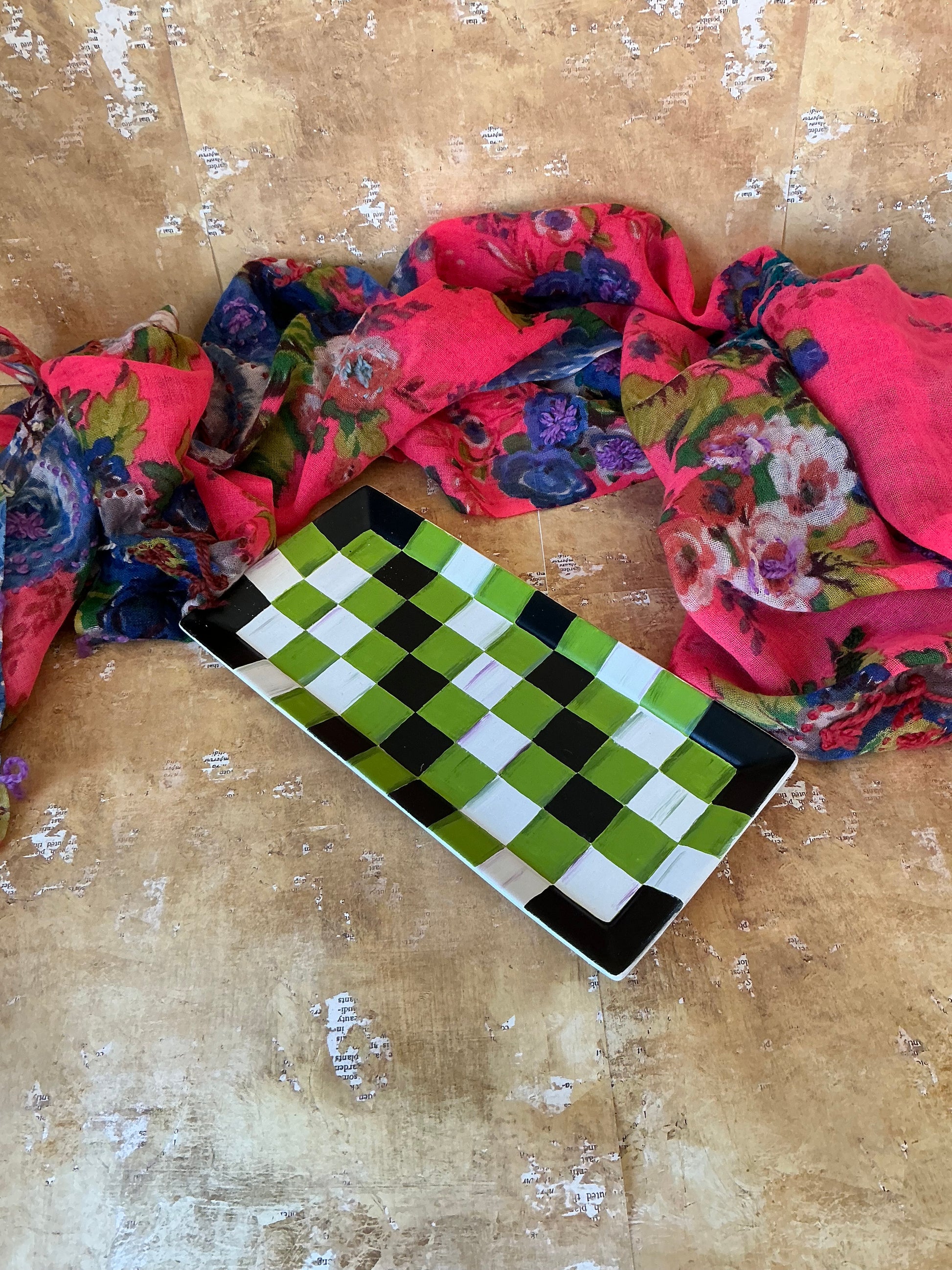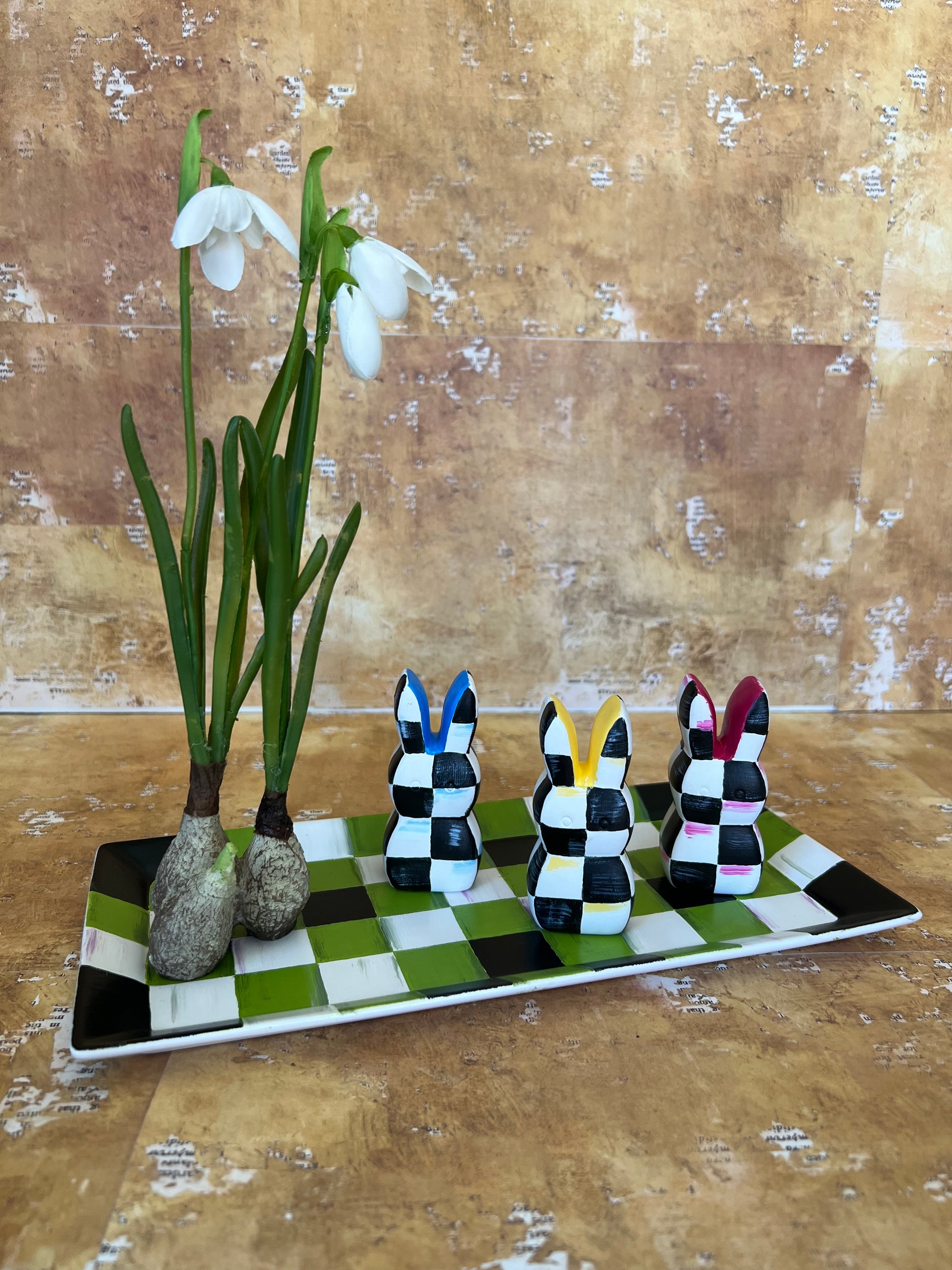This unique, ceramic tray is hand painted in green, white and black checks. It can serve as a trinket or jewelry dish or as a tray to display small collectibles. I've shown it as a display tray for my hand painted peeps which are available for sale in my store. The checks are shaded with eggplant and indigo adding depth and character.