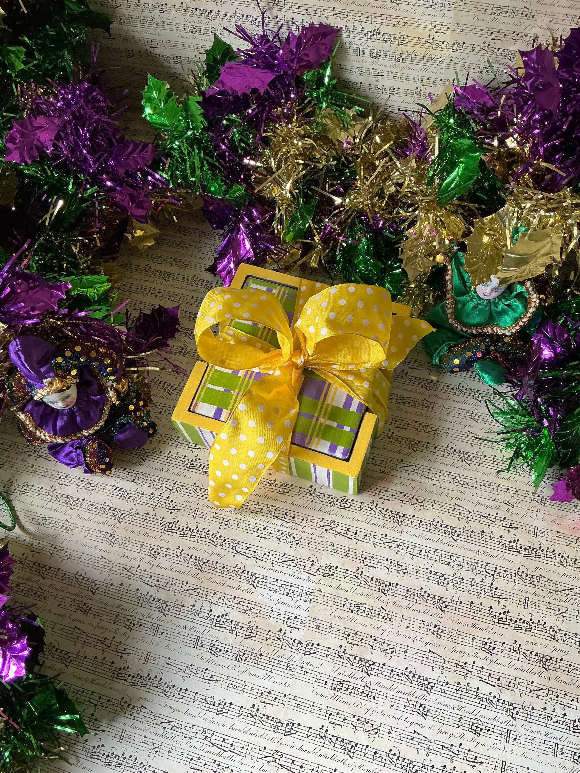Brighten up your bar with these colorful stone coasters! Hand painted with three stencils and sealed with three coats of satin Liquitex, you’ll enjoy using or displaying these for years! They also make a wonderful hostess or shower gift! They come wrapped in a yellow, polka dot bow, ready for gifting!