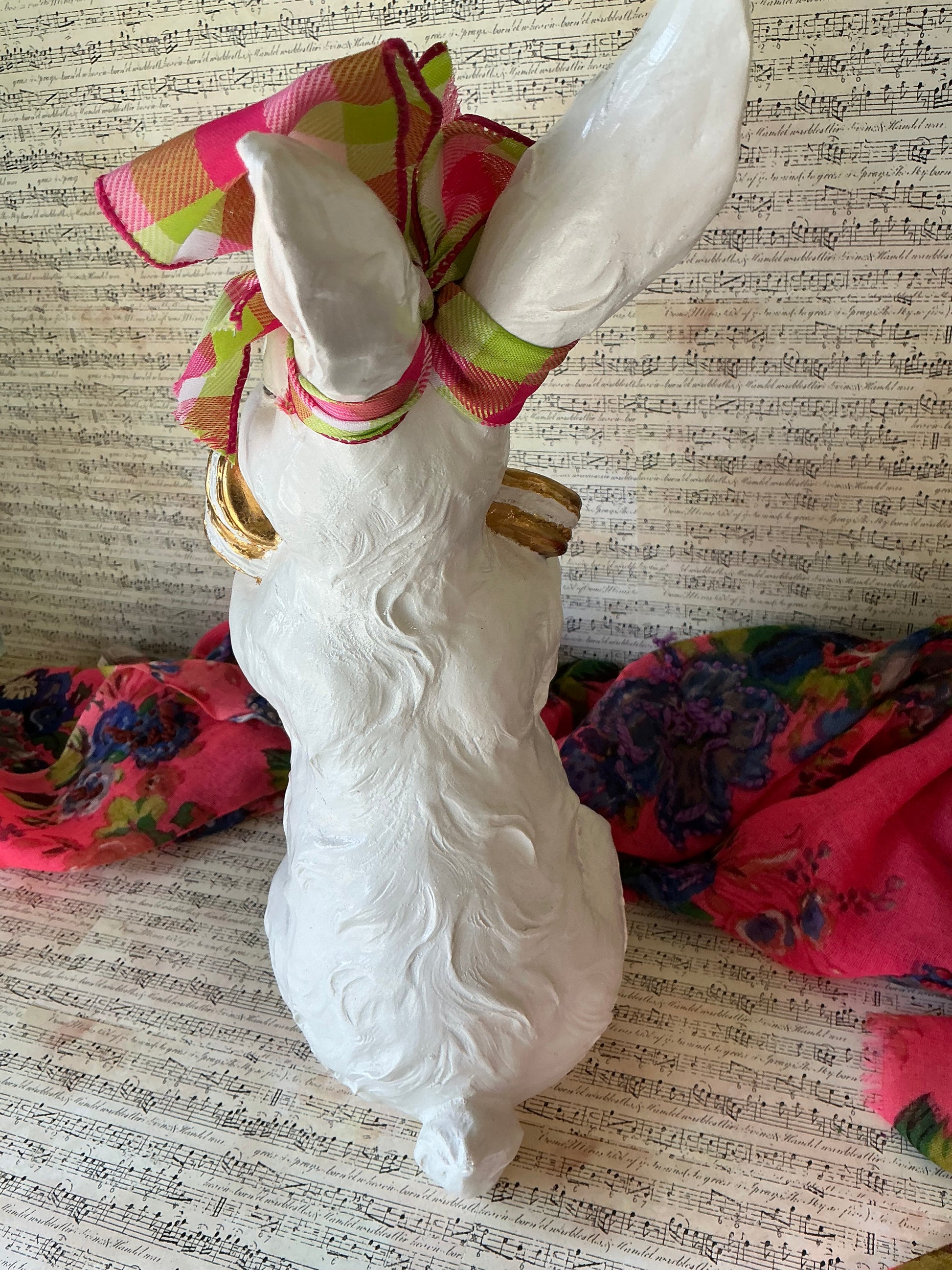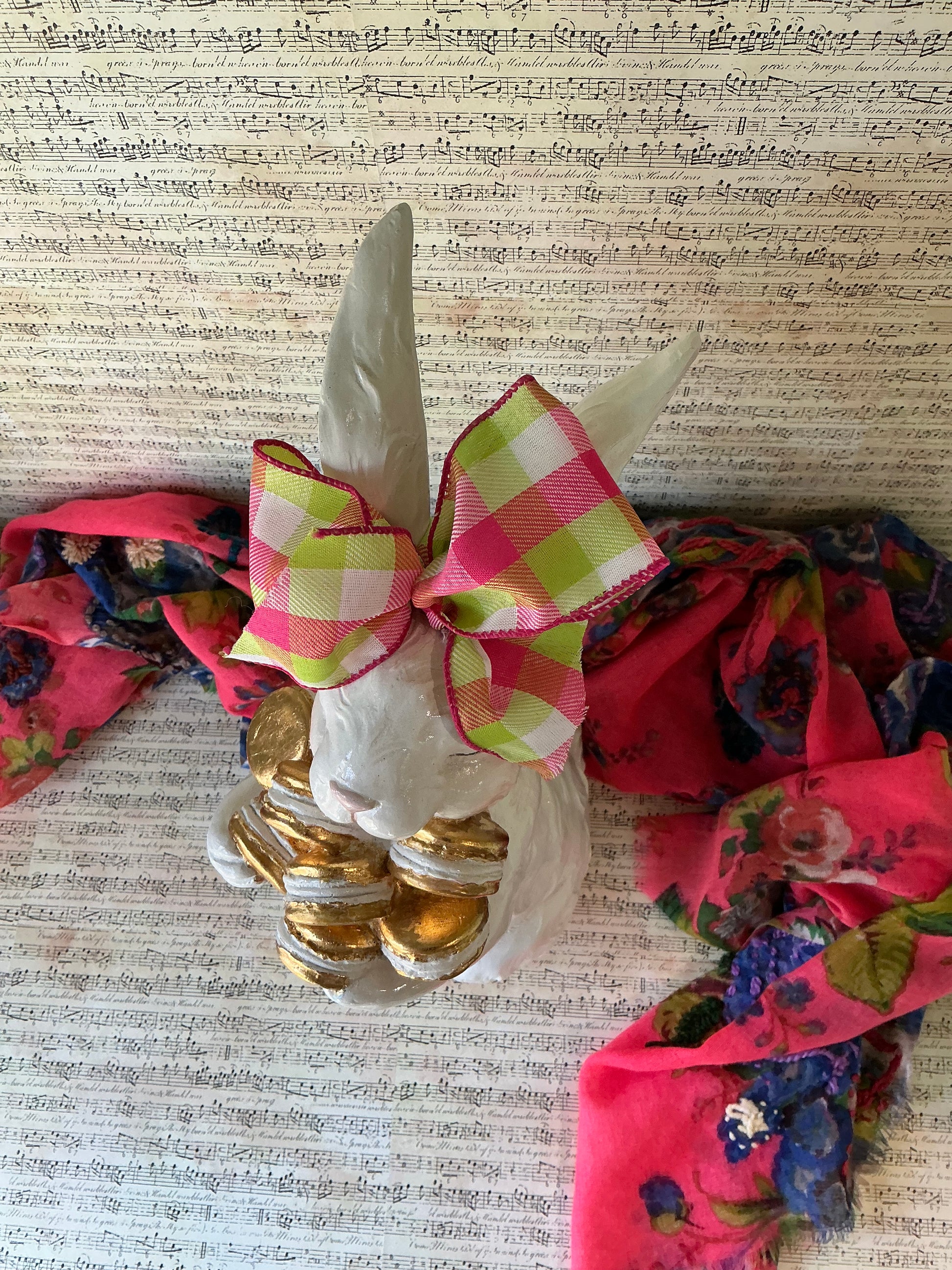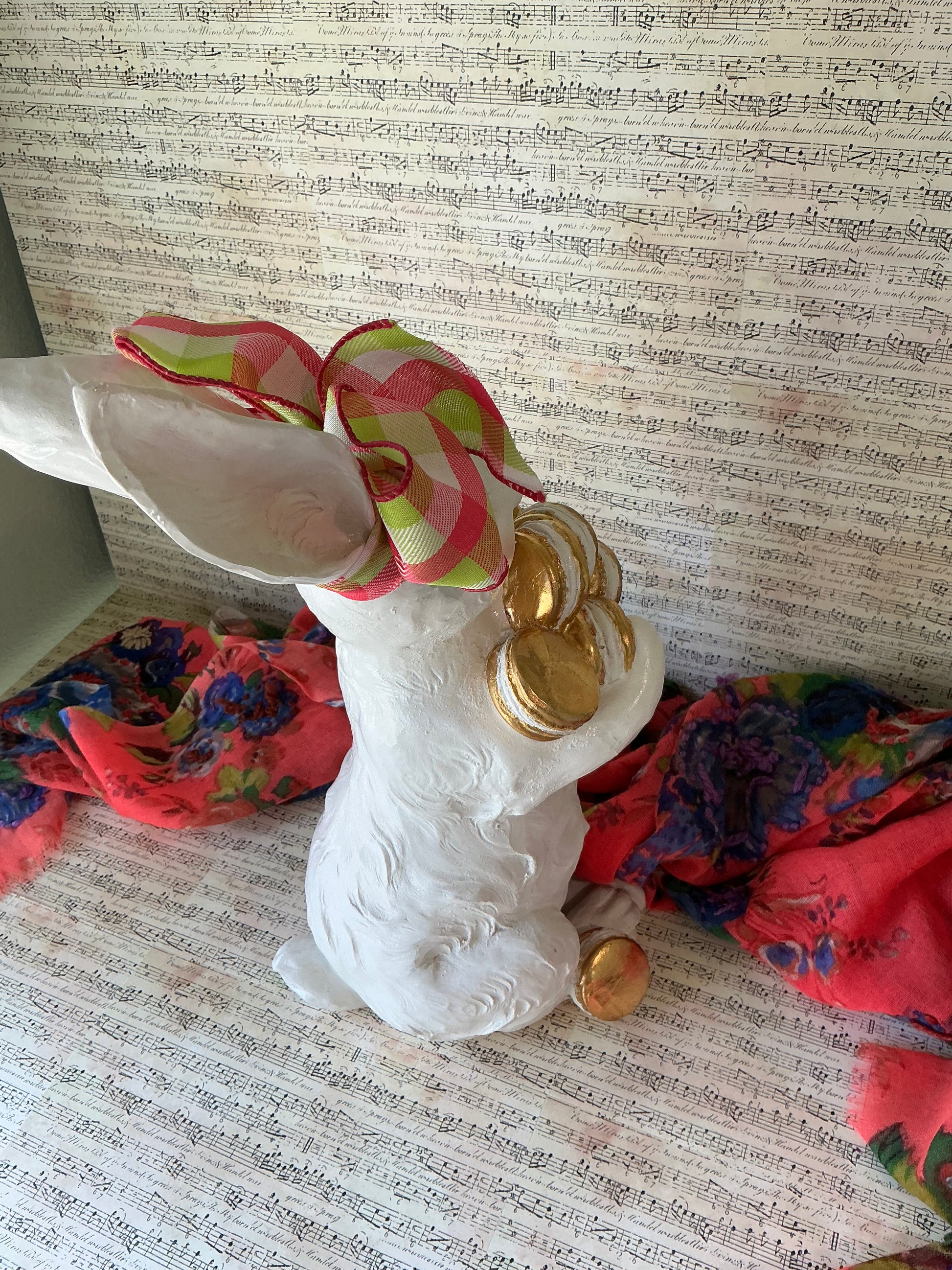 This beautiful resin rabbit appears to be swooning over an armful of gold - leaf macarons. She is tall, lightweight and clad in a plaid bow. Look closely to see the faintest pink inside her ears, cheeks and nose.