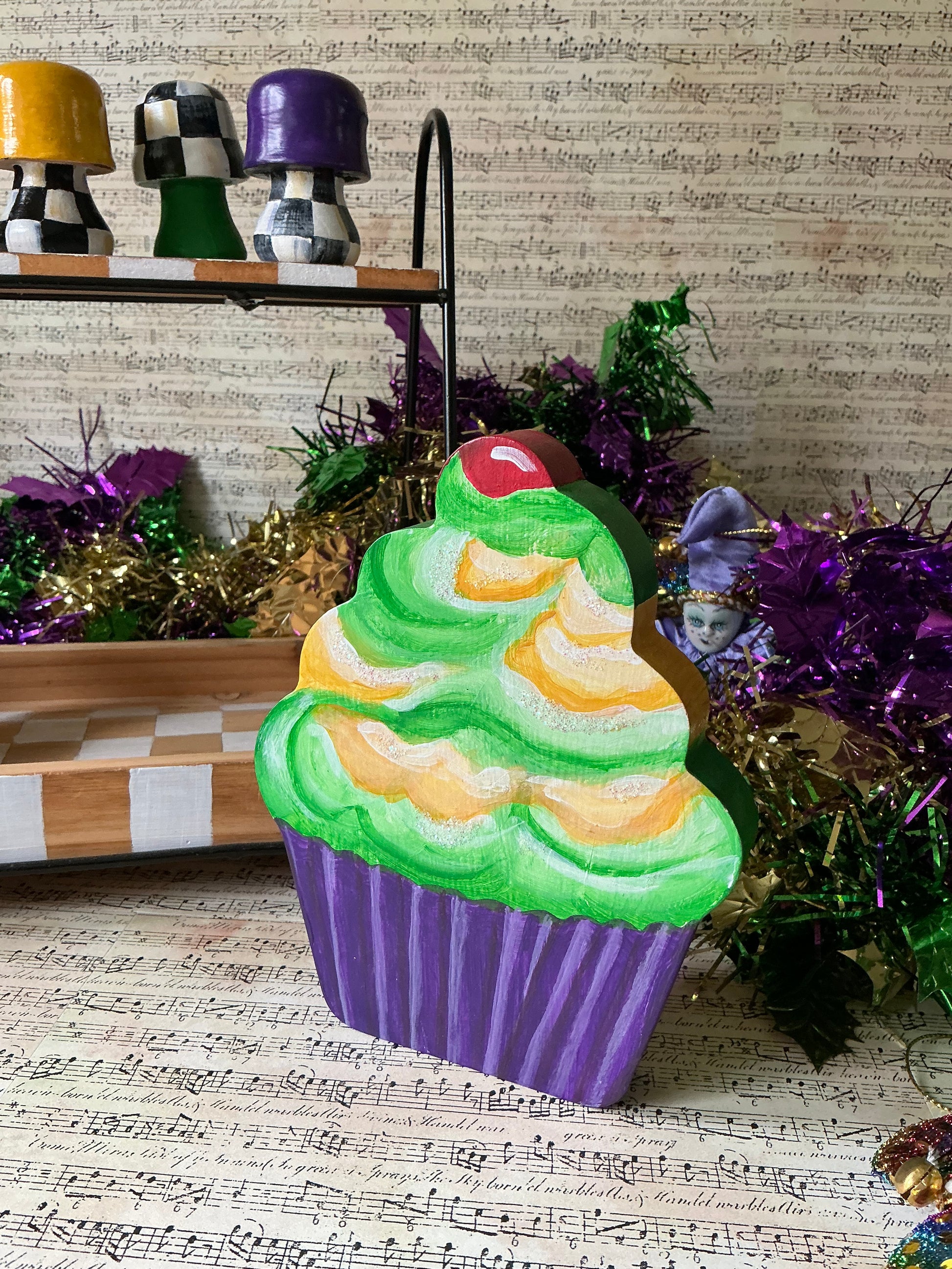 This hand painted free standing cupcake looks good enough to eat! Perfect addition to your Mardi Gras decor, it even sparkles! Look closely to see all the detailing! Could also be a colorful wreath sign. Lightweight, yet stands on its own securely.